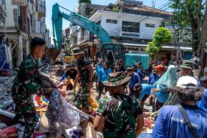 (250911) -- DENPASAR, 11 septiembre, 2025 (Xinhua) -- Integrantes del Ejército de Indonesia y residentes locales trabajando juntos para limpiar las zonas dañadas luego de las fuertes lluvias, en Denpasar, Bali, Indonesia, el 11 de septiembre de 2025. Las inundaciones provocadas por días de fuertes lluvias han causado la muerte de al menos 19 personas y la desaparición de otras 10 en la isla indonesia de Bali y en la provincia de Nusa Tenggara Oriental. (Xinhua/Dicky Bisinglasi) (da) (ra) (vf)