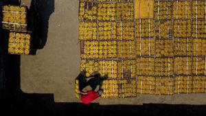 (250528) -- BOGOR, 28 mayo, 2025 (Xinhua) -- Vista aérea tomada con un dron de un trabajador colocando galletas amarillas tradicionales en platos de bambú previo a secarlas en un taller casero, en la aldea de Karadenan, en la regencia de Bogor, Java Occidental, Indonesia, el 28 de mayo de 2025. (Xinhua/Yorri Farli) (ah) (ra) (vf)