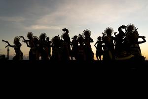 (250429) -- BALI, 29 abril, 2025 (Xinhua) -- Artistas realizan la danza tradicional balinesa Janger para celebrar el Día Internacional de la Danza en la playa de Pererenan, en la regencia de Badung, Bali, Indonesia, el 29 de abril de 2025. (Xinhua/Dicky Bisinglasi) (jg) (ra) (vf)