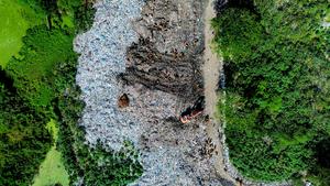 (250530) -- LHOKSEUMAWE, 30 mayo, 2025 (Xinhua) -- Vista aérea tomada con un dron el 30 de mayo de 2025 de una excavadora en el vertedero de Alue Lim previo al próximo Día Mundial del Medio Ambiente, en Lhokseumawe, en la provincia de Aceh, Indonesia. Este año, el Día Mundial del Medio Ambiente cae el 5 de junio y se centra en la lucha contra la contaminación por plásticos. (Xinhua/Fachrul Reza) (rtg) (vf)