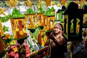(250312) -- MEDAN, 12 marzo, 2025 (Xinhua) -- Una mujer observa las decoraciones de Ramadán exhibidas en un puesto, en Medan, Sumatra del Norte, Indonesia, el 12 de marzo de 2025. (Xinhua/Ivan Damanik) (jg) (da) (vf)