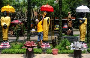 (250507) -- MOJOKERTO, 7 mayo, 2025 (Xinhua) -- Un trabajador limpia una estatua de Buda para dar la bienvenida al próximo Día de Vesak, en Mojokerto, Java Oriental, Indonesia, 7 de mayo de 2025. (Xinhua/Sahlan Kurniawan) (jg) (da)
