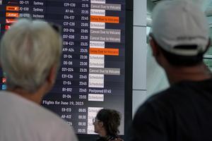 (250618) -- BALI, 18 junio, 2025 (Xinhua) -- Personas consultan la información de vuelos en el Aeropuerto Internacional I Gusti Ngurah Rai, en Bali, Indonesia, el 18 de junio de 2025. Las continuas erupciones del monte Lewotobi Laki-Laki en la provincia de Nusa Tenggara Oriental de Indonesia han obligado a los residentes a evacuar y causado cancelaciones generalizadas de vuelos, confirmaron el miércoles funcionarios y autoridades aeroportuarias. (Xinhua/Dicky Bisinglasi) (jg) (da) (ce)