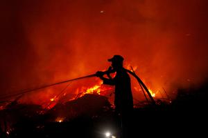 (251112) -- PEKANBARU, 12 noviembre, 2025 (Xinhua) -- Imagen del 11 de noviembre de 2025 de un miembro de la Agencia Nacional de Gestión de Desastres en Pekanbaru intentando extinguir un incendio de turbera, en Pekanbaru, Indonesia. (Xinhua/Hadly Vavaldi) (jg) (da) (ce)