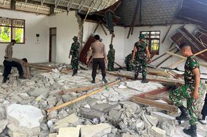 (250818) -- POSO, 18 agosto, 2025 (Xinhua) -- Soldados y agentes de policía indonesios limpian un edificio dañado tras un terremoto de magnitud 6,0, en la regencia de Poso, en Sulawesi Central, Indonesia, el 18 de agosto de 2025. Un terremoto de magnitud 6.0 sacudió la madrugada del domingo la regencia de Poso, en la provincia de Sulawesi Central, Indonesia, causando al menos 29 heridos, según informó en un comunicado la Agencia Nacional de Gestión de Desastres del país. (Xinhua/Rian Darmawan) (oa) (ah) (ce)