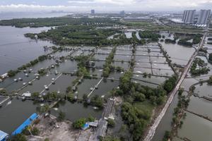 (251117) -- TANGERANG, 17 noviembre, 2025 (Xinhua) -- Vista aérea tomada con un dron el 13 de noviembre de 2025 de bosques de manglares, asentamientos costeros y estanques de peces en la zona costera de la aldea Muara, en la regencia de Tangerang, en la provincia de Banten, Indonesia. A nivel nacional, la pérdida de manglares se ha producido en casi todas las regiones. El Ministerio de Medio Ambiente estimó que Indonesia cuenta actualmente con 3,44 millones de hectáreas de manglares, más del 20 por ciento del total mundial, una cifra muy inferior a los 4,4 millones de hectáreas que existían en 1990. (Xinhua/Veri Sanovri) (oa) (ah) (vf)
