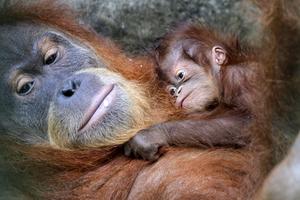 (250522) -- RIAU, 22 mayo, 2025 (Xinhua) -- Un orangután bebé es visto con su madre en un zoológico, en la Regencia de Kampar, provincia de Riau, Indonesia, el 22 de mayo de 2025. (Xinhua/Hadly Vavaldi) (da) (ce)