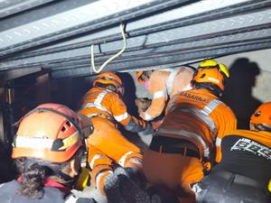 (251001) — YAKARTA, 1 octubre, 2025 (Xinhua) — Imagen proveída por la Agencia Nacional de Búsqueda y Rescate (Basarnas) de Indonesia de miembros del equipo de rescate evacuando a un sobreviviente (c) tras el colapso de un edificio escolar en la Escuela Internado Islámica Al Khoziny, en el distrito de Sidoarjo, en Java Oriental, Indonesia, el 1 de octubre de 2025. La cifra de muertos por el derrumbe de un edificio escolar en la provincia de Java Oriental, en Indonesia, ascendió a cinco, además, 84 personas siguen atrapadas bajo los escombros, informó el miércoles la agencia regional de rescate. (Xinhua/Basarnas) (jg) (ra) (vf) ***SOLO USO EDITORIAL***
