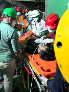 (251001) -- YAKARTA, 1 octubre, 2025 (Xinhua) -- Imagen proveída por la Agencia Nacional de Búsqueda y Rescate (Basarnas) de Indonesia de miembros del equipo de rescate evacuando a un sobreviviente (c) tras el colapso de un edificio escolar en la Escuela Internado Islámica Al Khoziny, en el distrito de Sidoarjo, en Java Oriental, Indonesia, el 1 de octubre de 2025. La cifra de muertos por el derrumbe de un edificio escolar en la provincia de Java Oriental, en Indonesia, ascendió a cinco, además, 84 personas siguen atrapadas bajo los escombros, informó el miércoles la agencia regional de rescate. (Xinhua/Basarnas) (jg) (ra) (vf) ***SOLO USO EDITORIAL***
