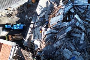 (251002) -- SIDOARJO, 2 octubre, 2025 (Xinhua) -- Vista aérea tomada con un dron de rescatistas trabajando con una grúa móvil en el sitio del colapso de un edificio escolar en la Escuela Internado Islámica Al Khoziny, en el distrito de Sidoarjo, Java Oriental, Indonesia, el 2 de octubre de 2025. Los equipos de rescate no han detectado hasta el momento signos de vida adicionales bajo los escombros del edificio escolar derrumbado en la provincia de Java Oriental de Indonesia, informó el jueves la agencia de gestión de desastres del país. (Xinhua/Sahlan Kurniawan) (jg) (ah) (vf)