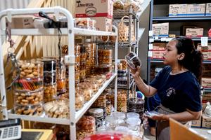 (250316) -- TANGERANG, 16 marzo, 2025 (Xinhua) -- Una empleada acomoda paquetes de galletas tradicionales pedidos por los clientes para el Eid al-Fitr, en Kampung Nastar en Tangerang, en la provincia de Banten, Indonesia, el 16 de marzo de 2025. (Xinhua/Agung Kuncahya B.) (rtg) (ah)