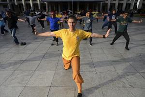 (250424) -- YAKARTA, 24 abril, 2025 (Xinhua) -- Personas practican Baduanjin, un ejercicio aeróbico tradicional chino, en Yakarta, Indonesia, el 24 de abril de 2025. (Xinhua/Zulkarnain) (rtg) (ra) (ce)