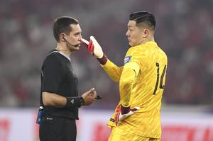 (250605) -- YAKARTA, 5 junio, 2025 (Xinhua) -- El guardameta, Wang Dalei (d), de China, se comunica con el árbitro, Rustam Lutfullin, durante el partido del Grupo C de las eliminatorias asiáticas para la Copa Mundial de la FIFA 2026 entre China e Indonesia, en Yakarta, Indonesia, el 5 de junio de 2025. (Xinhua/Jia Haocheng) (rtg) (ra) (ce)