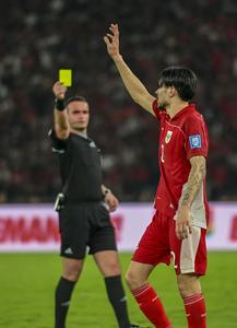 (250326) -- YAKARTA, 26 marzo, 2025 (Xinhua) -- Imagen del 25 de marzo de 2025 de Kevin Diks (d), de Indonesia, recibiendo una tarjeta amarilla durante el partido de eliminatorias asiáticas para la Copa Mundial de la FIFA 2026, entre Indonesia y Baréin en el Estadio Gelora Bung Karno, en Yakarta, Indonesia. (Xinhua/Zulkarnain) (ah) (ra) (vf)