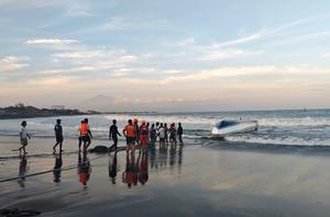 (250805) -- BALI, 5 agosto, 2025 (Xinhua) -- Imagen proveída por la Agencia Nacional de Búsqueda y Rescate de Indonesia (Basarnas) de personas y funcionarios colocando una cuerda para arrastrar la lancha rápida volcada hasta la orilla del mar en la playa de Sanur, en Bali, Indonesia, el 5 de agosto de 2025. El consulado general chino en Denpasar, Bali, Indonesia, confirmó el martes que dos ciudadanos chinos murieron en un accidente de vuelco de una lancha rápida frente a la isla indonesia de Bali esta mañana. (Xinhua/Basarnas) (jg) (ra) (ce)
