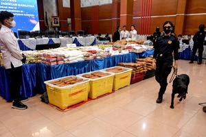 (250623) -- YAKARTA, 23 junio, 2025 (Xinhua) -- Un miembro del Equipo de Narcóticos de Aduanas y un perro son vistos previo a una conferencia de prensa sobre la revelación de una red de distribución de drogas en la oficina de la Dirección General de Aduanas e Impuestos, en Yakarta, Indonesia, el 23 de junio de 2025. La Agencia Nacional de Estupefacientes de Indonesia (BNN por sus siglas en indonesio), junto con las aduanas indonesias, han logrado detener a 285 sospechosos de tráfico de drogas con pruebas de diversos tipos de estupefacientes entre abril y junio de 2025. (Xinhua/Agung Kuncahya B.) (oa) (rtg) (vf)