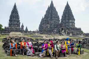 (250725) -- YOGYAKARTA, 25 julio, 2025 (Xinhua) -- Imagen del 24 de julio de 2025 de mujeres portando kebayas tradicionales vistas durante una conmemoración del Día Nacional del Kebaya llevado a cabo en el complejo del Templo Prambanan, en Yogyakarta, en Java Central, Indonesia. (Xinhua/Agung Supriyanto) (rtg) (ra) (ce)