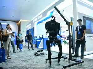 (241101) -- BEIJING, Nov. 1, 2024 (Xinhua) -- People watch a robot demonstration at the booth of Intel during the Tencent Global Digital Ecosystem Summit in Shenzhen, south China's Guangdong Province on Sept. 5, 2024. (Xinhua/Liang Xu)