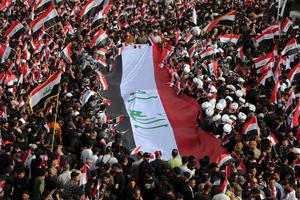 (260405) -- BAGDAD, 5 abril, 2026 (Xinhua) -- Imagen del 4 de abril de 2026 de personas participando en una manifestación condenando los ataques de Estados Unidos e Israel contra Irán, en Bagdad, Irak. (Xinhua/Khalil Dawood) (rtg) (ah)