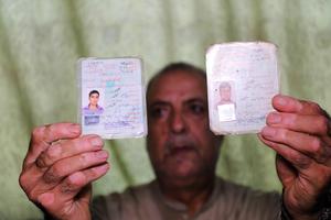 (250821) -- BAGDAD, 21 agosto, 2025 (Xinhua) -- Imagen del 16 de agosto de 2025 de Jasim Mohammed Al-Jumaili mostrando las tarjetas de identificación de sus dos hijos secuestrados por el Estado Islámico (EI), en Faluya, Irak. Años después de declarar la victoria sobre el grupo extremista EI en 2017, Irak continúa lidiando con el impacto duradero del terrorismo, desde persistentes amenazas a la seguridad hasta un profundo trauma social, dijeron residentes y un funcionario en el Día Internacional de Conmemoración y Homenaje a las Víctimas del Terrorismo, que se celebra el jueves. (Xinhua/Khalil Dawood) (da) (ra) (ce)