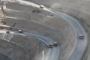 (250507) -- KERMAN, 7 mayo, 2025 (Xinhua) -- Imagen del 1 de mayo de 2025 de camiones transportando mineral de hierro en la mina de mineral de hierro Gol Gohar, en la provincia de Kerman, en el sureste de Irán. La mina de mineral de hierro Gol Gohar, ubicada en la provincia de Kerman, es la mina de mineral de hierro más grande de Irán. El depósito de mineral consta de seis zonas distintas, que abarcan un área de aproximadamente 40 km cuadrados. (Xinhua/Shadati) (jg) (da) (ce)