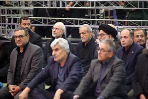 (250703) -- TEHERAN, 3 julio, 2025 (Xinhua) -- Imagen del 2 de julio de 2025 del presidente iraní, Masoud Pezeshkian (3-i, atrás), y el presidente del Parlamento de Irán, Baqer Qalibaf (2-i-atrás), asistiendo a una ceremonia conmemorativa, en Teherán, Irán. Ceremonias conmemorativas se llevaron a cabo aquí el miércoles para personas que perdieron su vida en los ataques israelíes. (Xinhua) (da) (ra) (ce)
