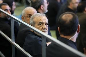 (250703) -- TEHERAN, 3 julio, 2025 (Xinhua) -- Imagen del 2 de julio de 2025 del presidente iraní, Masoud Pezeshkian, asistiendo a una ceremonia conmemorativa, en Teherán, Irán. Ceremonias conmemorativas se llevaron a cabo aquí el miércoles para personas que perdieron su vida en los ataques israelíes. (Xinhua) (da) (ra) (ce)
