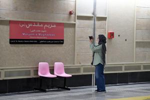 (251018) -- TEHERAN, 18 octubre, 2025 (Xinhua) -- Una periodista trabaja en la recién inaugurada estación Maryam Moghaddas de la línea 6 del metro de Teherán, en Teherán, Irán, el 18 de octubre de 2025. (Xinhua/Shadati) (oa) (da)