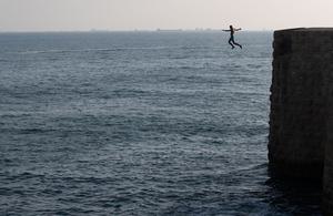 (250613) -- AKKO, 13 junio, 2025 (Xinhua) -- Imagen del 12 de junio de 2025 de un adolescente saltando al mar para refrescarse, en la ciudad de Akko, en el norte de Israel. (Xinhua/Chen Junqing) (oa) (ra) (ce)