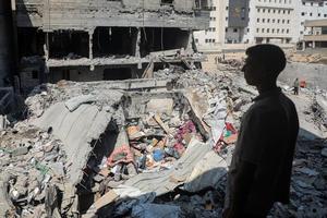 (250608) -- GAZA, June 8, 2025 (Xinhua) -- A Palestinian looks at buildings destroyed in an Israeli airstrike in Gaza City, June 7, 2025. (Photo by Rizek Abdeljawad/Xinhua)