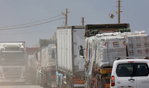 (250728) -- SDEROT, 28 julio, 2025 (Xinhua) -- Imagen del 27 de julio de 2025 de camiones cargados con ayuda humanitaria esperando para entrar a la Franja de Gaza, en la frontera israelí con Gaza. El Ejército israelí anunció el domingo una pausa humanitaria diaria de 10 horas en sus operaciones en partes de la Franja de Gaza, junto con la apertura de rutas seguras para la entrega de ayuda, en medio de la creciente presión internacional por la agravación de la crisis alimentaria allí. (Xinhua/Gil Cohen Magen) (rtg) (ah) (vf)