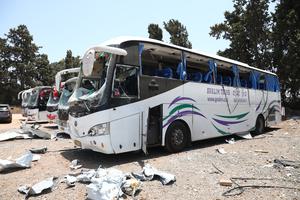 (250617) — HERZLIYA, 17 junio, 2025 (Xinhua) — Autobuses son afectados por un ataque iraní con misiles, en Herzliya, en el centro de Israel, el 17 de junio de 2025. El conflicto aéreo entre Israel e Irán entró en su quinto día, con un saldo de al menos 244 muertos en Irán y 24 en Israel. La escalada comenzó después de que Israel lanzó ataques aéreos sorpresivos contra Irán el 13 de junio. (Xinhua/Gideon Markowicz/JINI) (oa) (ra) (ce)