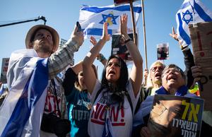 (250215) -- TEL AVIV, 15 febrero, 2025 (Xinhua) -- Simpatizantes de los rehenes observan la transmisión televisada del proceso de liberación de rehenes a través de una pantalla gigante en una plaza, en Tel Aviv, Israel, el 15 de febrero de 2025. Hamás y la Yihad Islámica palestina entregaron el sábado a tres rehenes israelíes al Comité Internacional de la Cruz Roja en Khan Younis, en el sur de la Franja de Gaza, como parte del sexto intercambio en la primera fase del acuerdo de alto el fuego. (Xinhua/Chen Junqing) (jg) (da)