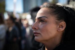 (250215) -- TEL AVIV, 15 febrero, 2025 (Xinhua) -- Una mujer observa la transmisión televisada del proceso de liberación de rehenes a través de una pantalla gigante en una plaza, en Tel Aviv, Israel, el 15 de febrero de 2025. Hamás y la Yihad Islámica palestina entregaron el sábado a tres rehenes israelíes al Comité Internacional de la Cruz Roja en Khan Younis, en el sur de la Franja de Gaza, como parte del sexto intercambio en la primera fase del acuerdo de alto el fuego. (Xinhua/Chen Junqing) (jg) (da)