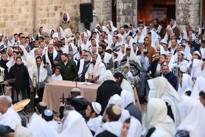 (250418) — SAFED, 18 abril, 2025 (Xinhua) — Imagen del 17 de abril de 2025 de devotos judíos asistiendo a una oración de la mañana de Shajarit para la Pascua, en Safed, en el norte de Israel. La Pascua (Pésaj) de este año se celebra en Israel desde el atardecer del 12 de abril hasta la noche del 19 de abril, en conmemoración del éxodo de los israelitas de la esclavitud en el antiguo Egipto hace unos 3.500 años. (Xinhua/David Cohen/JINI) (jg) (da) (ce)