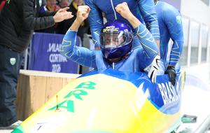 (260222) -- CORTINA D'AMPEZZO, 22 febrero, 2026 (Xinhua) -- Edson Luques Bindilatti/Davidson Henrique de Souza/Rafael Souza da Silva/Luis Bacca Goncalves, de Brasil, reaccionan al término de la serie 4 de cuádruple masculino de bobsleigh en los Juegos Olímpicos de Invierno Milán-Cortina 2026, en Cortina D'Ampezzo, Italia, el 22 de febrero de 2026. (Xinhua/Ding Xu) (oa) (ah)