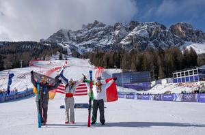 (260208) -- CORTINA D'AMPEZZO, 8 febrero, 2026 (Xinhua) -- La medallista de oro, Breezy Johnson (c), de Estados Unidos, la medallista de plata, Emma Aicher (i), de Alemania, y la medallista de bronce, Sofia Goggia, de Italia, asisten a la ceremonia de premiación del descenso femenino de esquí alpino de los Juegos Olímpicos de Invierno Milán-Cortina 2026, en Cortina, Italia, el 8 de febrero de 2026. (Xinhua/Fei Maohua) (rtg) (da)