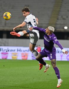 (250207) — FLORENCIA, 7 febrero, 2025 (Xinhua) — Imagen del 6 de febrero de 2025 de Carlos Augusto (i), de Inter de Milán, disputando el balón con Dodo, de Fiorentina, durante un partido de fútbol de la Serie A entre Fiorentina e Inter de Milán, en Florencia, Italia. (Xinhua/Augusto Casasoli) (rtg) (ra) (vf)