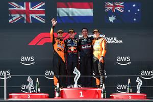 (250519) -- IMOLA, 19 mayo, 2025 (Xinhua) -- Imagen del 18 de mayo de 2025 del piloto neerlandés de la escudería Red Bull, Max Verstappen (2-i), posando junto al piloto británico de la escudería McLaren, Lando Norris (i), y el piloto australiano de la escudería McLaren, Oscar Piastri (d), durante la ceremonia de premiación después del Gran Premio de Emilia-Romaña de Fórmula Uno, en el Autódromo Internacional Enzo y Dino Ferrari, en Imola, Italia. (Xinhua/Qian Jun) (rtg) (ah) (vf)