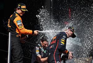 (250519) -- IMOLA, 19 mayo, 2025 (Xinhua) -- Imagen del 18 de mayo de 2025 del piloto australiano de la escudería McLaren, Oscar Piastri (i), rociendo con champaña al piloto neerlandés de la escudería Red Bull, Max Verstappen, durante la ceremonia de premiación después del Gran Premio de Emilia-Romaña de Fórmula Uno, en el Autódromo Internacional Enzo y Dino Ferrari, en Imola, Italia. (Xinhua/Li Jing) (rtg) (ah) (vf)