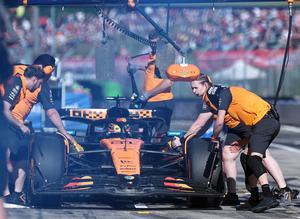 (250517) — IMOLA, 17 mayo, 2025 (Xinhua) — Imagen del 16 de mayo de 2025 de mecánicos de la escudería McLaren trabajando en el monoplaza del piloto australiano, Oscar Piastri, durante la segunda sesión de prácticas previo al Gran Premio de Emilia-Romaña de Fórmula Uno, en el Autódromo Internacional Enzo y Dino Ferrari, en Imola, Italia. (Xinhua/Li Jing) (rtg) (da)