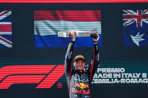 (250519) -- IMOLA, 19 mayo, 2025 (Xinhua) -- Imagen del 18 de mayo de 2025 del piloto neerlandés de la escudería Red Bull, Max Verstappen, festejando durante la ceremonia de premiación después del Gran Premio de Emilia-Romaña de Fórmula Uno, en el Autódromo Internacional Enzo y Dino Ferrari, en Imola, Italia. (Xinhua/Qian Jun) (rtg) (ah) (vf)