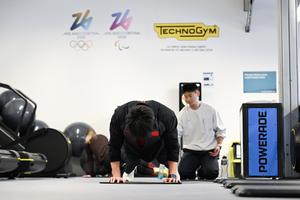 (260203) -- CORTINA D'AMPEZZO, 3 febrero, 2026 (Xinhua) -- El atleta chino, Li Chunjian (frente), entrena en el gimnasio de la Villa Olímpica y Paralímpica de Cortina D'Ampezzo antes de los Juegos Olímpicos de Invierno de Milán-Cortina 2026, en Cortina D'Ampezzo, Italia, el 3 de febrero de 2026. (Xinhua/Lian Yi) (oa) (ah) (vf)