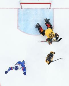 (260218) -- MILAN, 18 febrero, 2026 (Xinhua) -- El guardameta, Philipp Grubauer (arriba), de Alemania, falla al atajar el disco durante los cuartos de final de la clasificatoria masculina entre Eslovaquia y Alemania de hockey sobre hielo en los Juegos Olímpicos de Invierno Milán-Cortina 2026, en Milán, Italia, el 18 de febrero de 2026. (Xinhua/Wang Kaiyan) (ah) (ra) (ce)