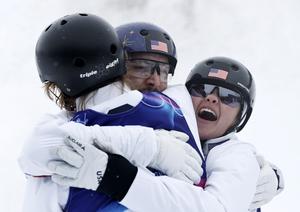 (260221) -- LIVIGNO, 21 febrero, 2026 (Xinhua) -- Christopher Lillis (c), Connor Curran (i) y Kaila Kuhn, de Estados Unidos, festejan al término de la final 2 de aerials por equipos mixtos de esquí acrobático en los Juegos Olímpicos de Invierno Milán-Cortina 2026, en Livigno, Italia, el 21 de febrero de 2026. (Xinhua/Wang Peng) (oa) (da)