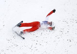 (260221) -- LIVIGNO, 21 febrero, 2026 (Xinhua) -- Lina Kozomara, de Suiza, cae sobre la nieve durante la final 2 de aerials por equipos mixtos de esquí acrobático en los Juegos Olímpicos de Invierno Milán-Cortina 2026, en Livigno, Italia, el 21 de febrero de 2026. (Xinhua/Wang Peng) (oa) (da)