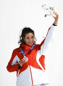 (260209) -- LIVIGNO, 9 febrero, 2026 (Xinhua) -- La medallista de plata Gu Ailing, de China posa durante la ceremonia de premiación de esquí slopestyle femenino de esquí acrobático en los Juegos Olímpicos de Invierno Milán-Cortina 2026, en Livigno, Italia, el 9 de febrero de 2026. (Xinhua/Hu Chao) (rtg) (ah) (vf)
