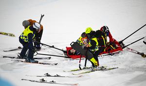 (260221) -- LIVIGNO, 21 febrero, 2026 (Xinhua) -- Imagen del 20 de febrero de 2026 de Lee Seunghun, de República de Corea, lesionándose durante la sesión de entrenamiento previa a la final de halfpipe masculino de esquí acrobático en los Juegos Olímpicos de Invierno Milán-Cortina 2026, en Livigno, Italia. (Xinhua/Xia Yifang) (jg) (da)