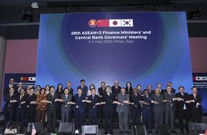 (250505) -- MILAN, 5 mayo, 2025 (Xinhua) -- Imagen del 4 de mayo de 2025 de invitados posando para una fotografía grupal previo a la 28 reunión anual de los ministros de Finanzas y gobernadores de los bancos centrales de la Asociación de Naciones del Sudeste Asiático (ASEAN), China, Japón y la República de Corea (ASEAN Más Tres o 10+3), en Milán, Italia. Los ministros de Finanzas y los gobernadores de los bancos centrales de la ASEAN más Tres concluyeron su 28 reunión anual aquí el domingo. Copresidida este año por China y Malasia, la reunión se centró en la evolución macroeconómica mundial y regional y en la cooperación financiera regional en el marco del 10+3 y emitió una declaración conjunta. (Xinhua/Li Jing) (oa) (ah) (ce)