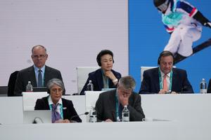 (260203) -- MILAN, 3 febrero, 2026 (Xinhua) -- Li Lingwei (c-atrás), miembro del Comité Ejecutivo del Comité Olímpico Internacional (COI), es visto durante el primer día de la Sesión 145 del COI, en Milán, Italia, el 3 de febrero de 2026. (Xinhua/Sun Fei) (oa) (ah)